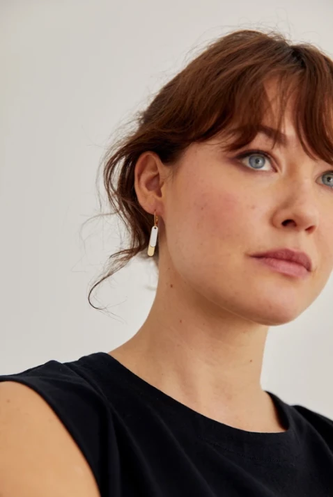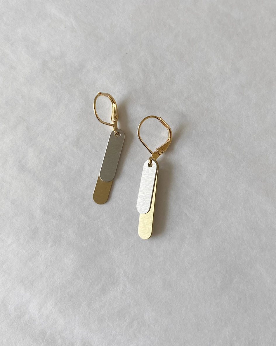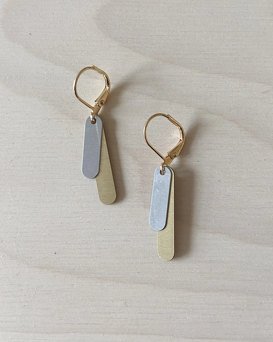 Etched brass & steel layered charm earrings on a gold plated ear wire.