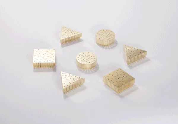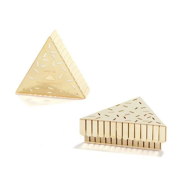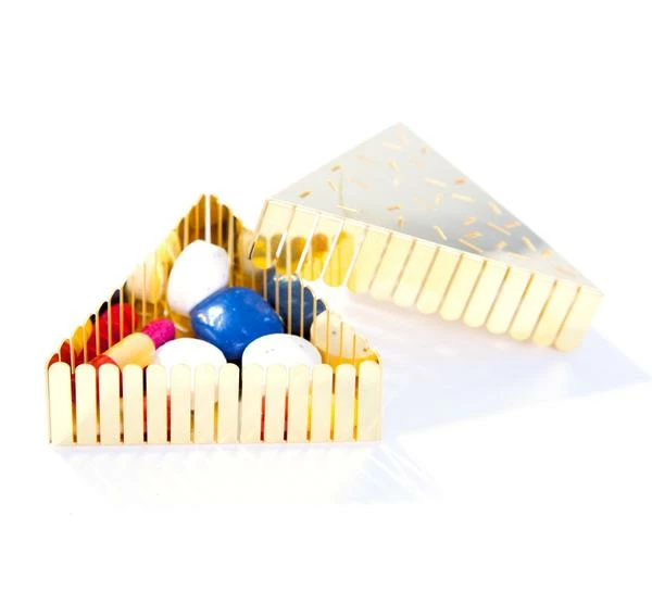 Small triangular pillbox with lid in solid brass. Complimentary to round RECORD and square STOP boxes. Dimensions: L: 5 cm x W: 5 cm x H: 3 cm Material: Shiny Brass Made in Italy.