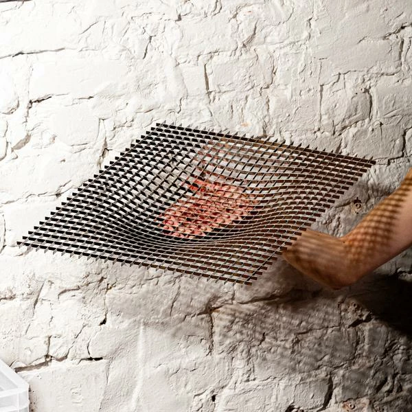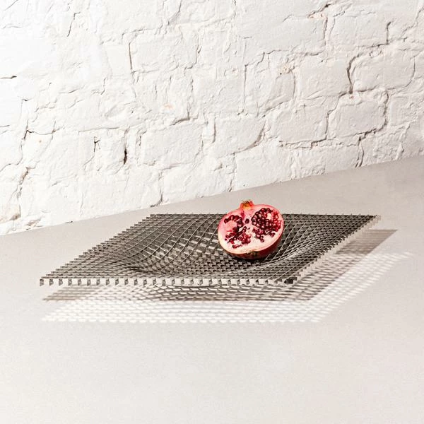Inspired by sci-fi fantasies of bending the space-time continuum, we made this shiny, warped grid, responding to a hidden force. The pieces are ingeniously locked into place providing some flexibility, so you can play with the exact angle of the grid. Dimensions: 36 x 36 x 4,5 cm Material: Stainless steel Made in Italy, assembled in Berlin.