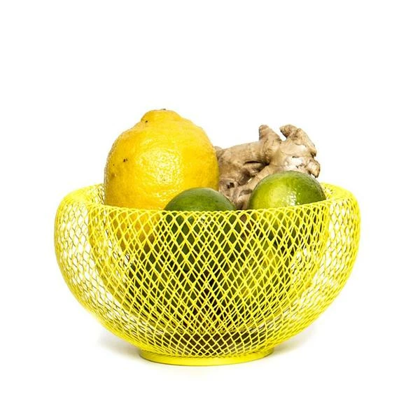 For your table or your ceiling – Our NEST system is a powder coated metal bowl, ideal for fruit, bread or vegetables. Its airy, open construction allows air to circulate. However, a hole in the bottom, plugged with a cork ball, makes it possible to flip the bowl upside down and use it as a standard E27 screw fitting lampshade, where the same airy construction creates a beautiful shadow pattern on the ceiling. NEST is available in white, black, yellow, blue, red and mint green. There are two sizes: 30 cm diameter by 15 cm height, and 20 cm diameter by 10 cm high. Dimensions: ø: 20 cm x H: 10 cm Material: Powder Coated Steel Made in China.