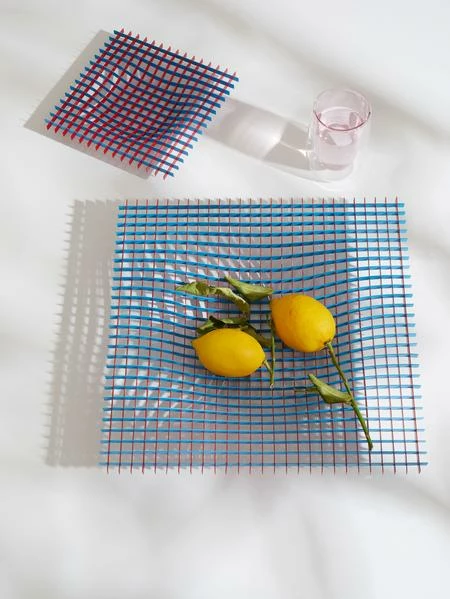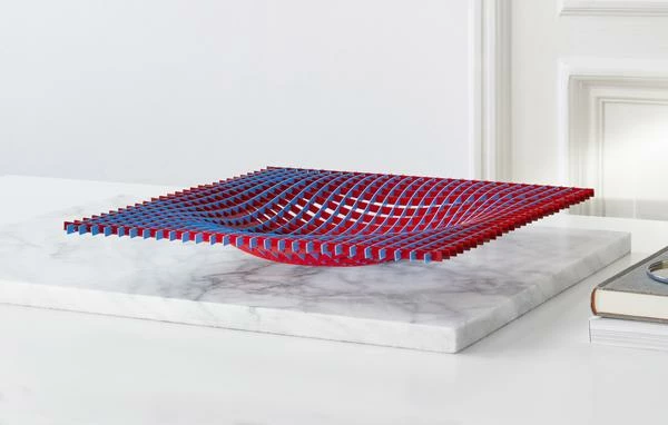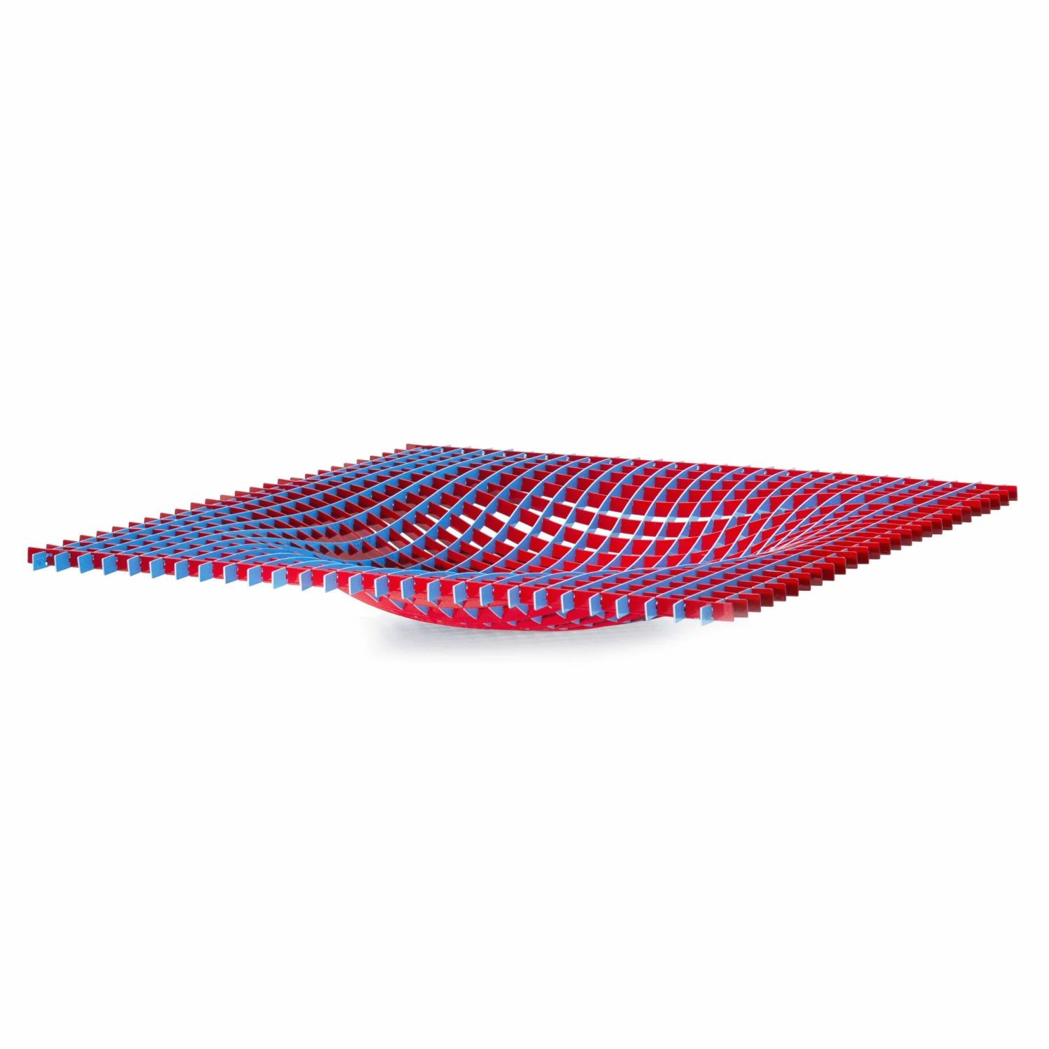 We were approached by the Centre Pompidou to interpret the unique location through a special product to be sold exclusively in the Centre Pompidou and through our own online store. Inspired by sci-fi fantasies of bending the space-time continuum, we made this red and blue, warped grid tray responding to a hidden force. The colour changes depending on which angle you look at the tray from. The pieces are ingeniously locked into place providing some flexibility, so you can play with the exact angle of the grid. Dimensions: 36 x 36 x 5 cm Material: Stainless steel, painted. Made in Italy, assembled in Berlin.