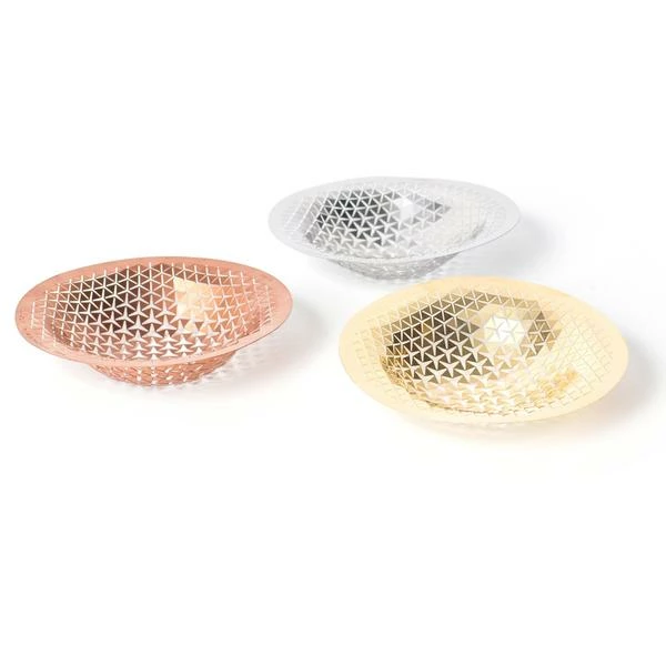 Make a bowl out of a disk. PUSH is delivered as a flat metal plate that you can give a unique shape with your fingers. By gently applying pressure, you can create a little vessel to store valuables like chains and rings, or bits and pieces like keys and make-up. PUSH is a combination of mathematical geometries and the best craftsmanship, available in four different metals. Dimensions: ø: 10 cm each Material: 1 each of copper, stainless steel and shiny brass Made in Italy.