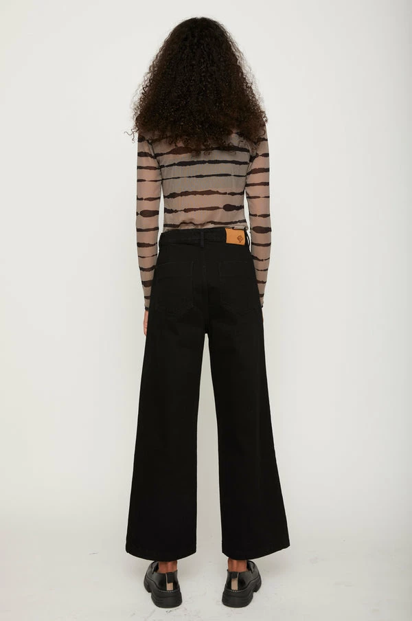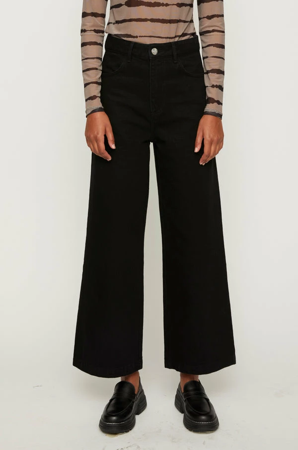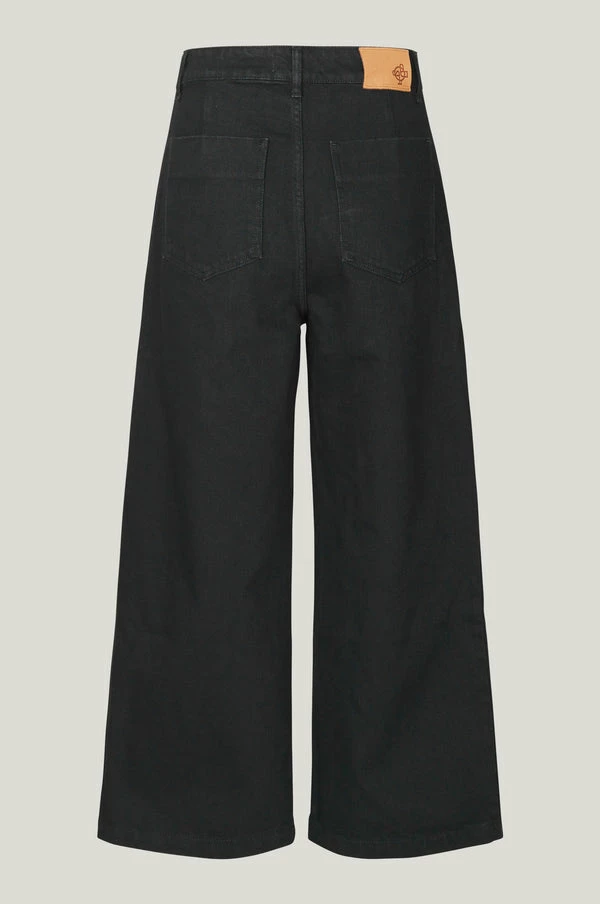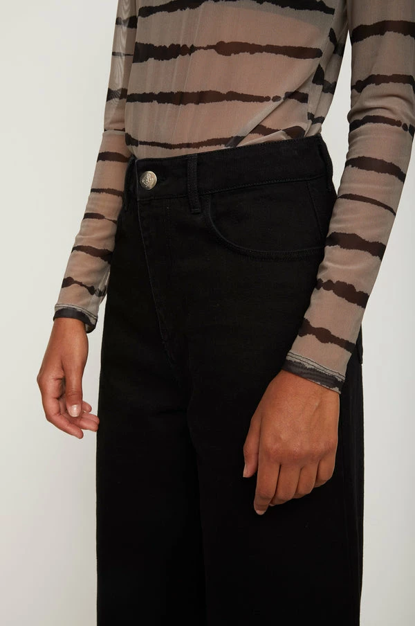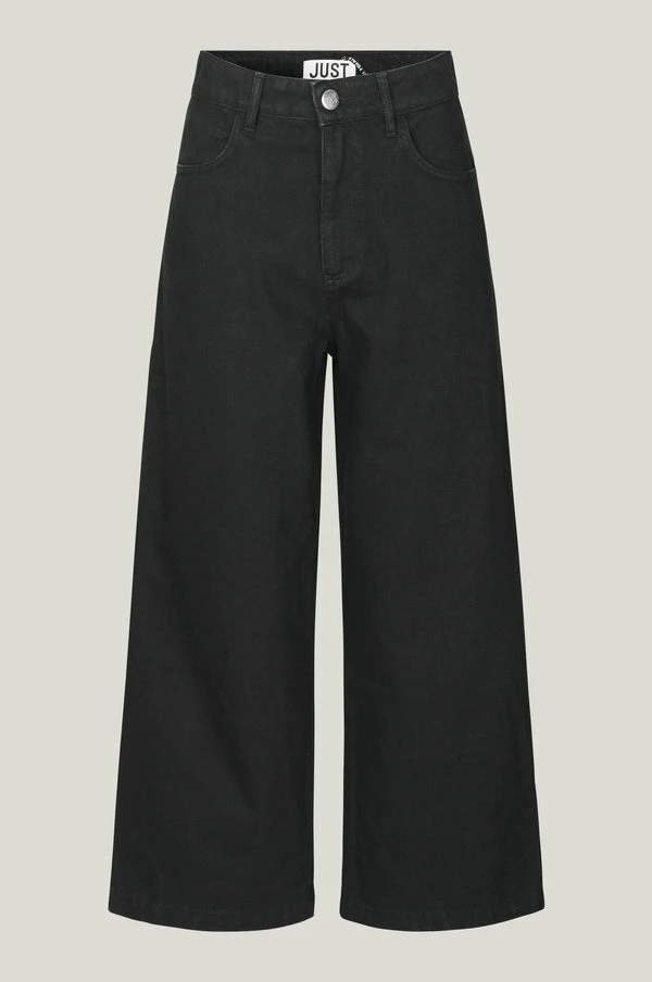 Description: Durable jeans made from an organic cotton blend. The jeans have a fixed waistline, belt loops, hidden zipper, and visible silver button with the JUST symbol. On the back of the waistband is a brown leather badge with the JUST symbol on the left-hand side. The fit is high-rise with wide legs that cut flatteringly just at the ankles.