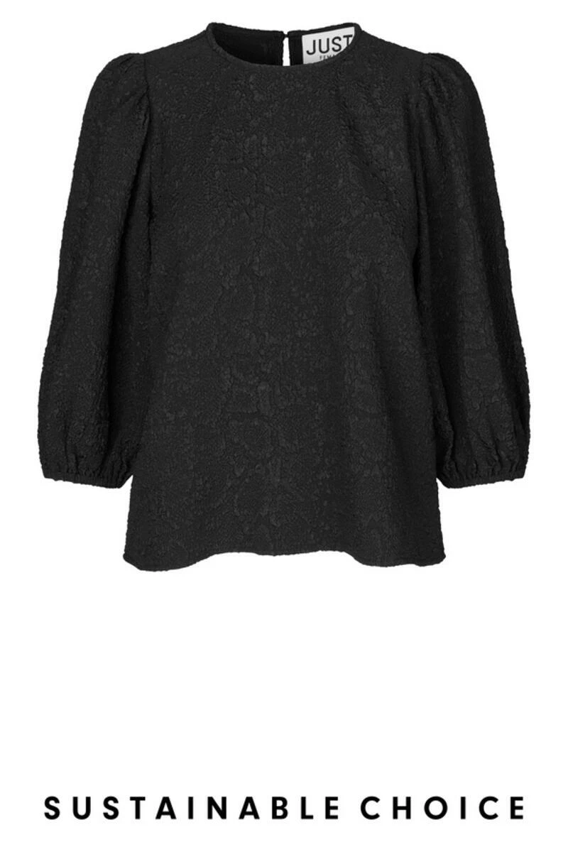 Elasticated 3/4 length sleeves and a round neckline with a button closure at the back.