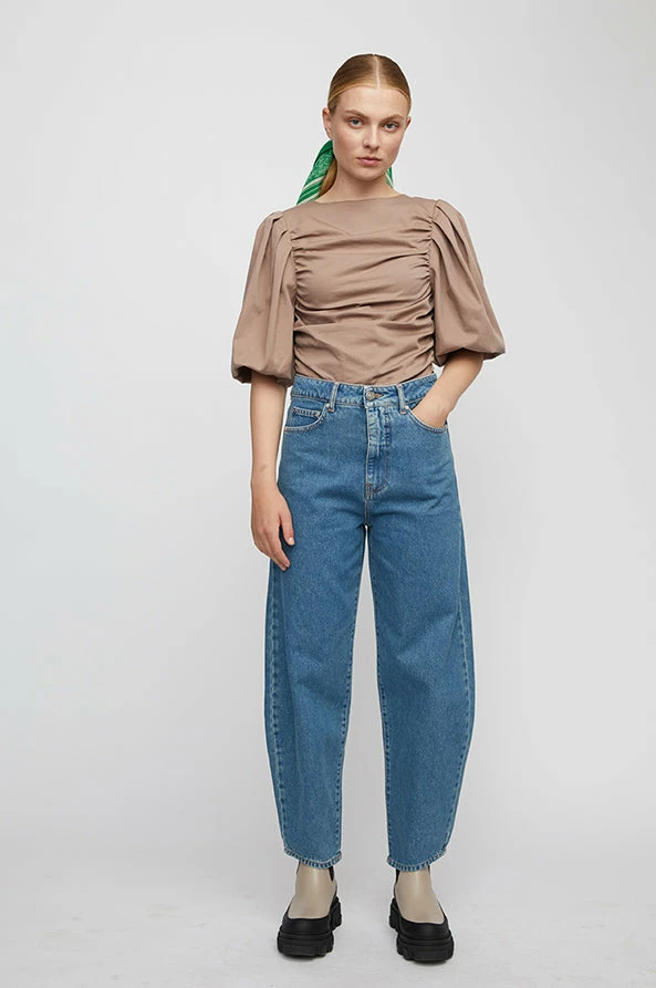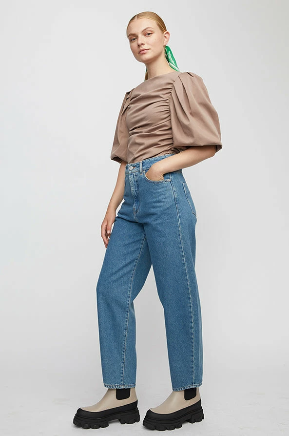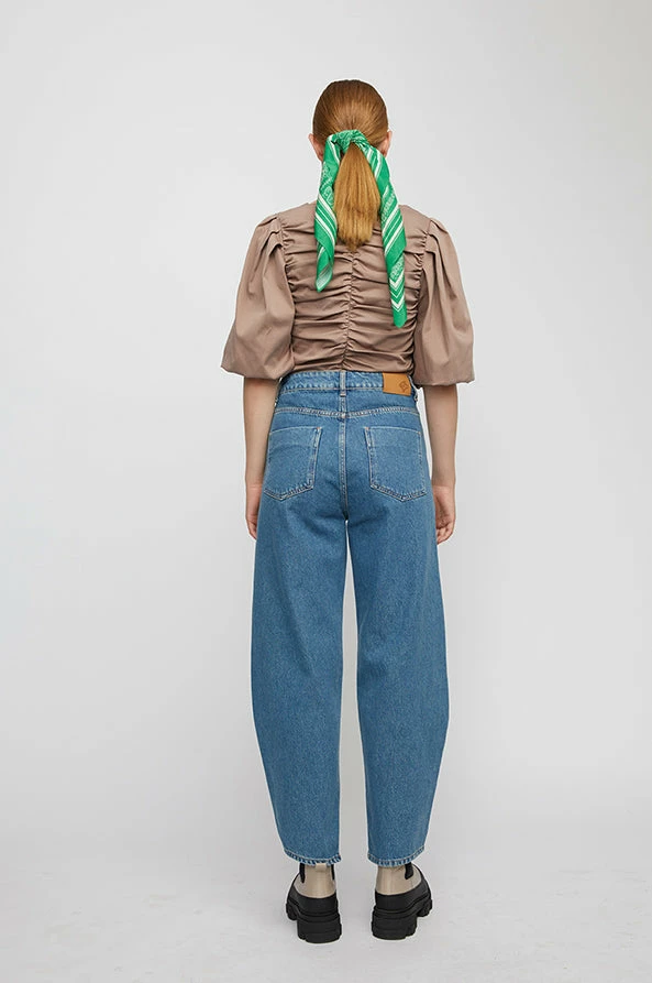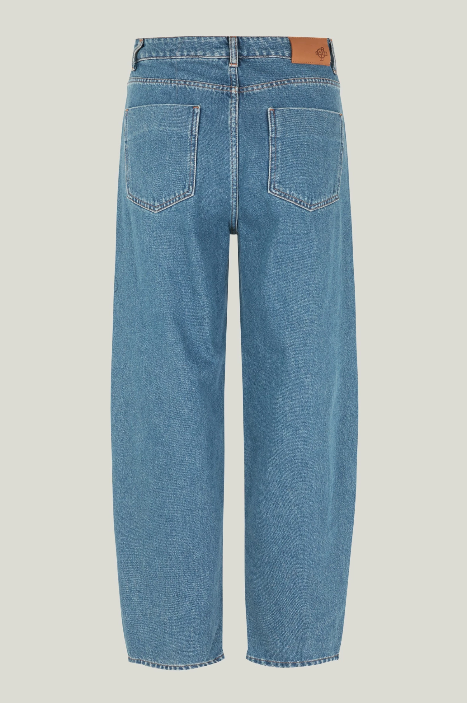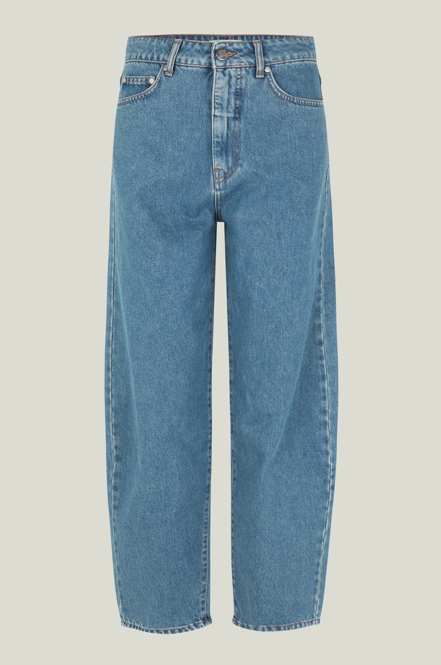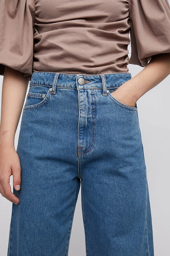 Just female, boyfriend-jeans made from 100% organic cotton. These jeans have a fixed waistline, belt loops, hidden zipper, and visible silver button. On the back of the waistband is a brown leather badge. The fit is high-rise with bowed legs that cut above the ankle.