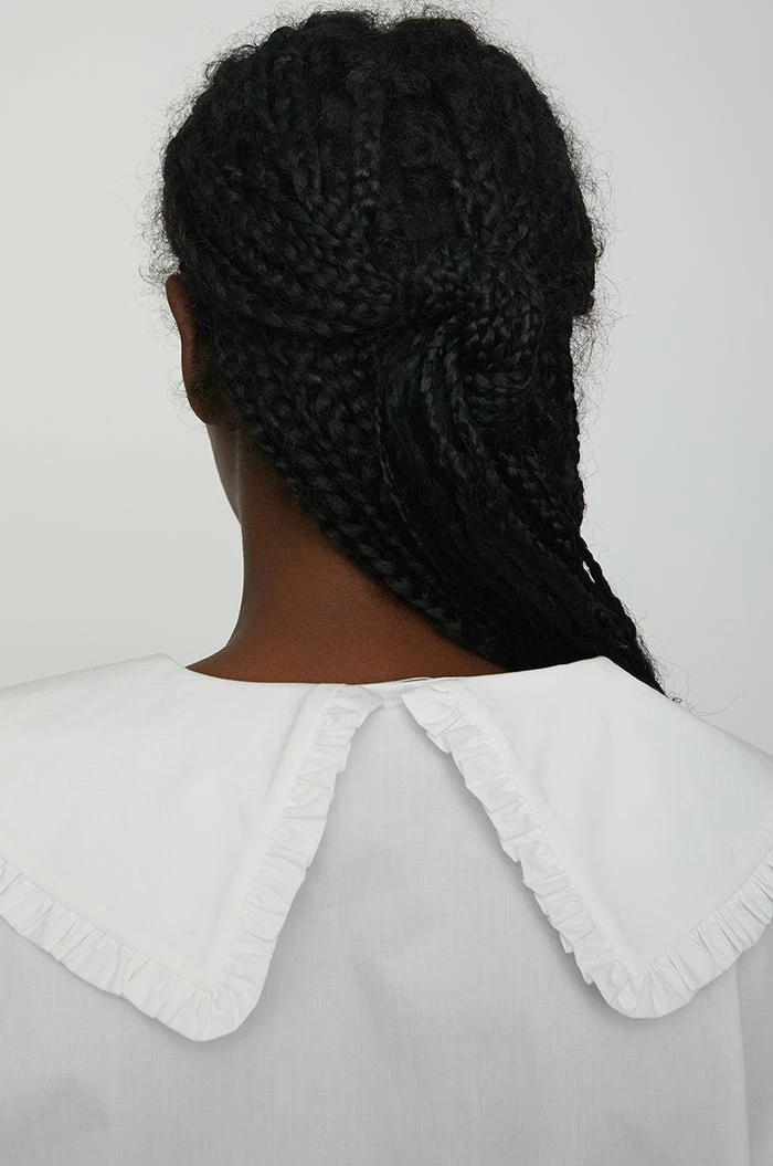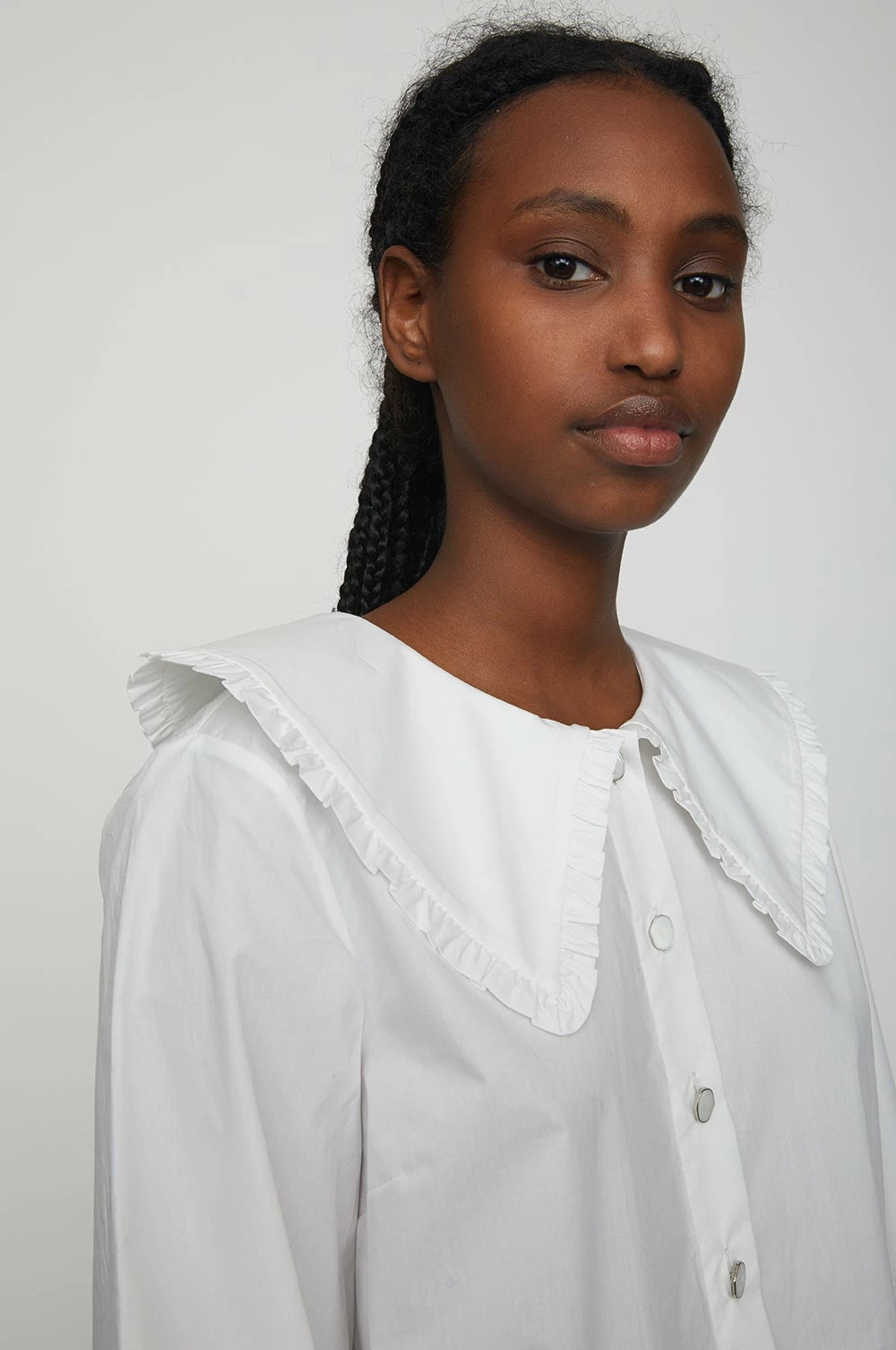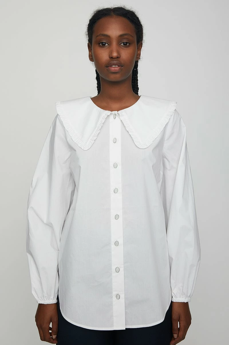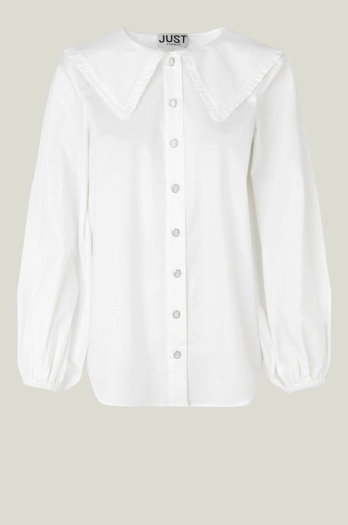The Just Female Eve shirt in white is a simple yet stylish 100% organic cotton shirt with a feminine oversize collar. The classic fit shirt has voluminous, long sleeves, a round neckline and front button fastening. The rounded hem ensures a perfect fit and look regardless of whether the item is tucked in or left out.