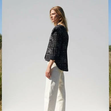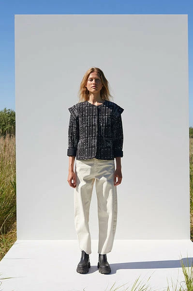 The Miracle jacket has a quilted body with an all over paisley print in black and white. The jacket is oversized with an accentuated shoulder detail, a round neckline and hidden snap button closure. Hip length at the front and curving at the back to reach the top of the thigh. Size + Fit Oversized fit // Curved hem with lower back // Round neckline // Long sleeves. Materials + Care Outer – 60% Viscose (EcoVero) 40% Viscose // Lining – 100% Polyester. Machine wash cold // Air dry where possible // Follow garment instructions. Max Shrinkage – 5% // Avoid shrinkage by less washing. Made in Turkey. Sustainability Miracle jacket forms part of the brands ‘Sustainable Choice Initiative’; which ensures an increased focus on more environmentally friendly materials in production of our garments. This focus begins with the designers and consequently in the buyers and manufacturers. A ‘SUSTAINABLE CHOICE’ style is made with more environmentally friendly materials, such as organic cotton or recycled polyester.