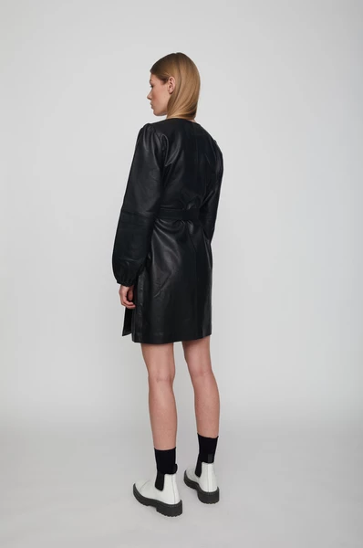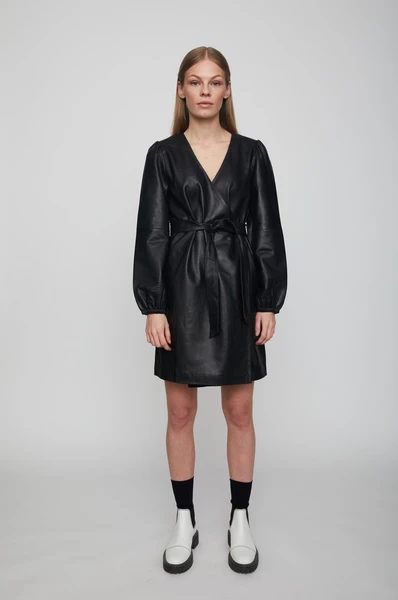The Just Female Marley leather dress in black is a stunning dress in a buttery soft leather. The dress wraps over at the front with a leather belt at the waist and elasticated cuffs and the must have pockets on the side seams. This dress is one that you will have in your wardrobe year after year, a classic but stylish design that can be dressed up or down.