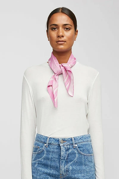 Silk scarf in a paisley print. This is a stylish reworking or the classic bandana and can be worn around the neck, as a headscarf or hair tie or to add a splash of colour to an outfit in the pocket or belt loop.