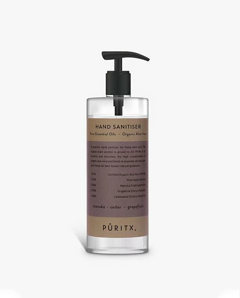 Puritx create superior hand sanitisers for those who care.The natural plant based alcohol is proven to kill 99.9% of all bacteria and microbes, whilst a high concentration of organic aloe vera and blend of essential oils will give your hands all their known natural goodness.Pure Essential Oils: • Manuka, Cedar, Grapefruit Manufactured in UK with 99% of its ingredients being of natural origin, of which 29% are certified organic. Volume: 250 mlHeight: 12.0 cmDiameter: 3.0 cmEnough for approximately 100 applications