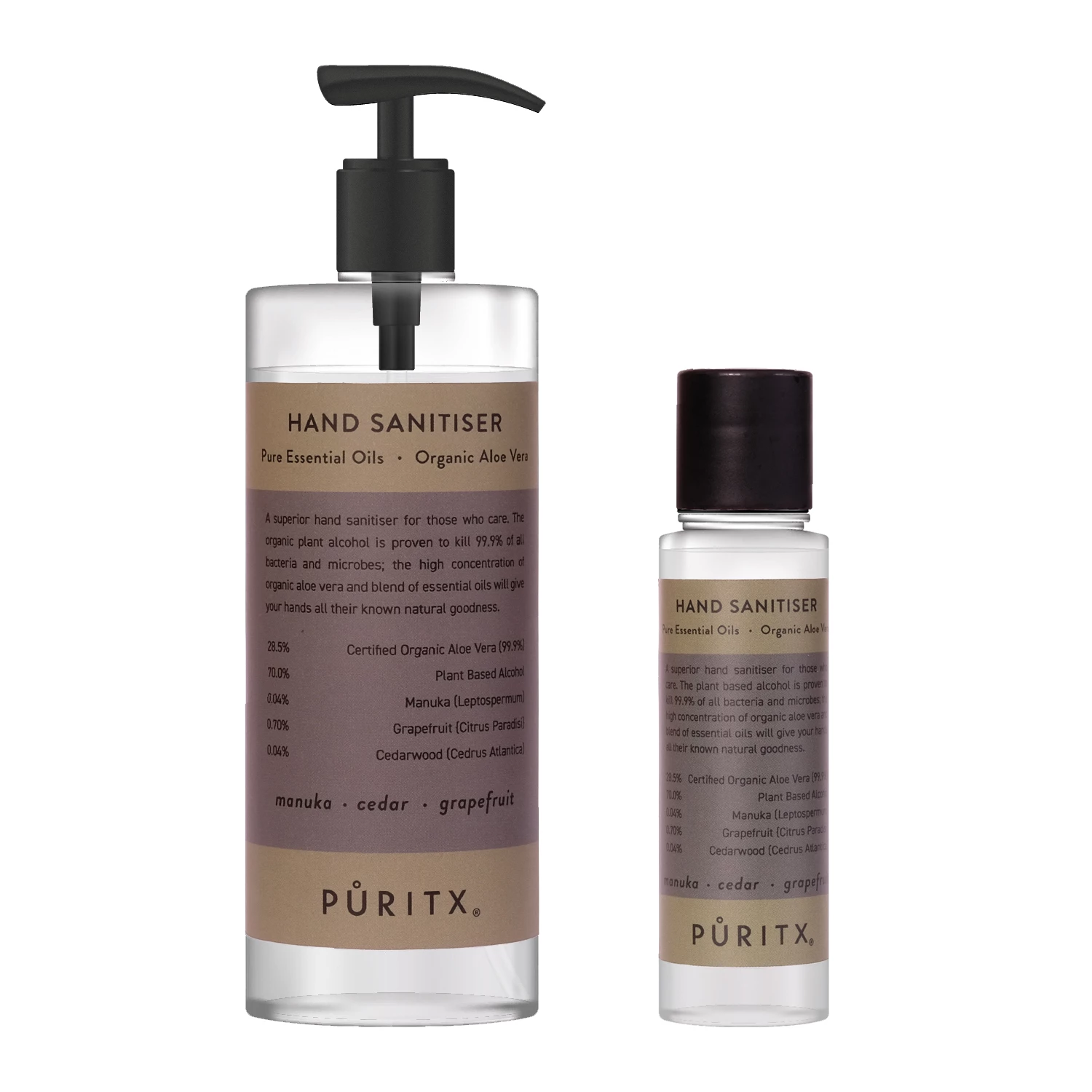 Description: A superior hand sanitiser by puritx for those who care. The organic plan alcohol is proven to kill 99,9% of all bacteria and microbes. The high concentration of organic aloe vera and blend of essential oils will give your hands all their know natural goodness.