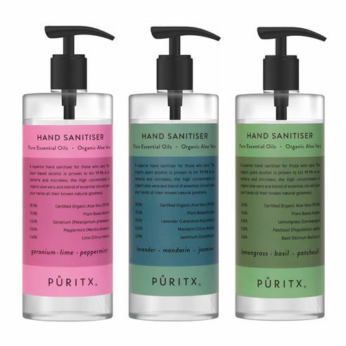A superior hand sanitiser for those who care. The natural plant based alcohol is proven to kill 99.9% of all bacteria and microbes; the high concentration of organic aloe vera and blend of essential oils will give your hands all their known natural goodness. All Puritx products are vegan, not tested on animals and organic.