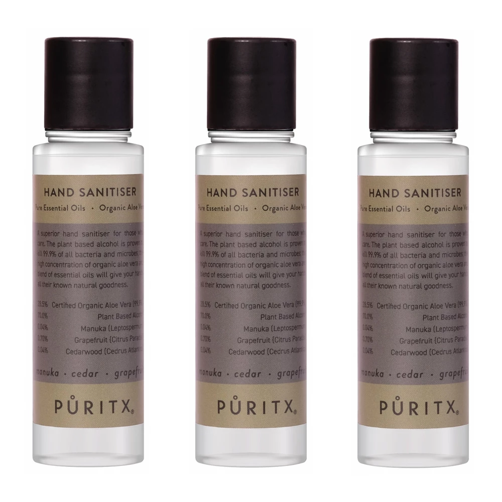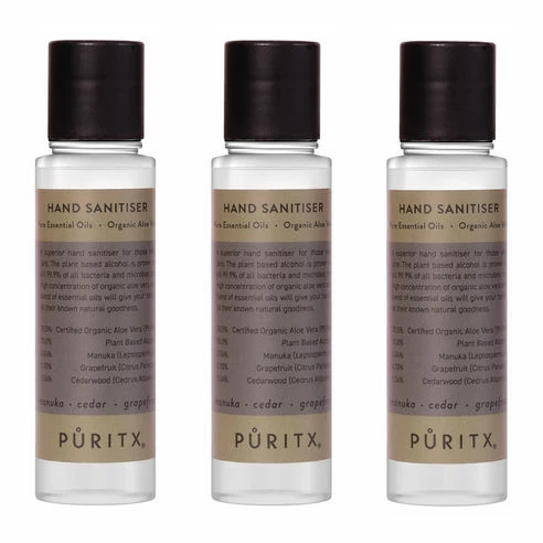 Puritx Set of 3 Organic Manuka, Cedar & Grapefruit Essential Oils & Aloe Vera Vegan Hand Sanitiser 60ml Travel Size