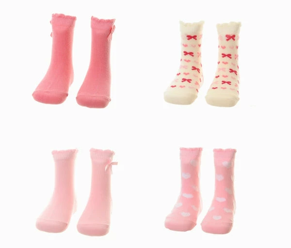 Set of 4x cotton socks featuring heart and bow prints, as well as bow details. Soft, comfy and easy to put on with a ribbed top to keep socks up! 80% cotton, 18% nylon and 2% spandex .