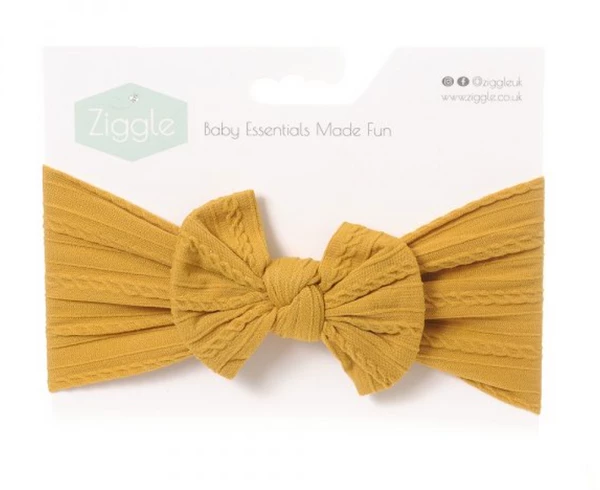 Ziggle Top Bow Turban Headband Mustard No hair, who cares? Add the finishing touch to your little one’s outfit with this gorgeous soft fabric headband. In a delicately designed cable and line pattern for a subtle, stylish look with a fixed bow, so no need to tie each time.